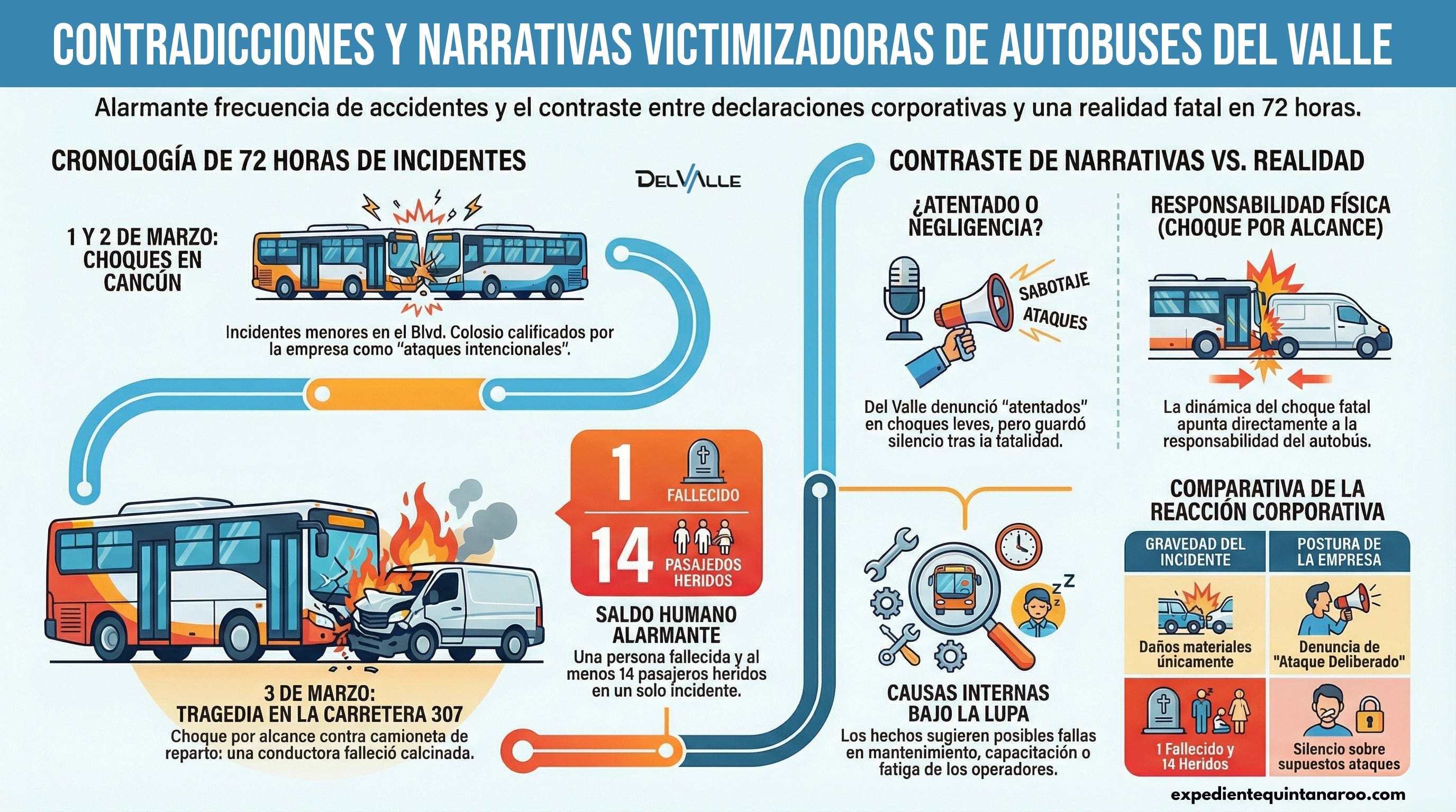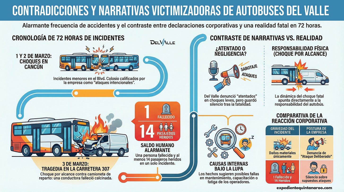 En apenas tres días de marzo de 2026, la empresa Autobuses del Valle —dedicada al transporte de personal para hoteles y empresas en la Riviera Maya y Cancún— ha estado involucrada en tres percances viales distintos. Lo que más llama la atención es el patrón en la narrativa que la compañía ha elegido difundir: en los dos primeros incidentes (domingo y lunes), inmediatamente después del suceso, Del Valle emitió comunicados y denuncias calificándolos como “ataques intencionales” o “agresiones deliberadas” por parte de vehículos particulares. Sin embargo, en el tercer y más grave —el choque fatal de este martes 3 de marzo—, la empresa no ha invocado esa misma tesis. Y no es difícil entender por qué: la dinámica del accidente deja muy mal parado cualquier intento de presentarlo como un “atentado”.