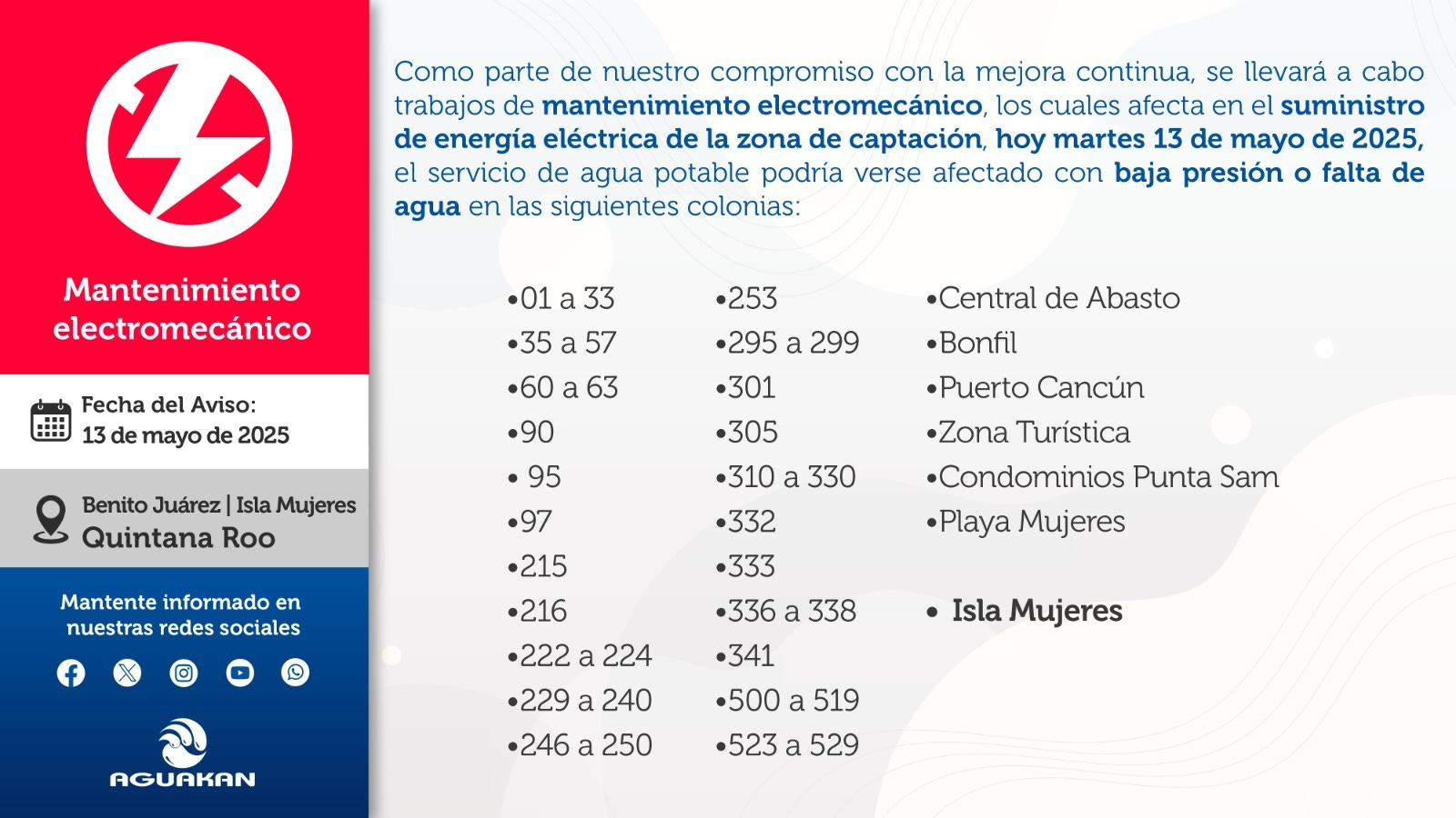Cancún.- Este martes 13 de mayo de 2025, Aguakan, ha anunciado trabajos de mantenimiento electromecánico en la zona de captación, un procedimiento que podría dejar sin agua potable o con baja presión a decenas de colonias en Cancún e Isla Mujeres. La lista incluye áreas clave como la Zona Hotelera, Punta Sam y Playa Mujeres, afectando desde el Centro de Abasto hasta puntos residenciales como las secciones 01, 35 y 97.