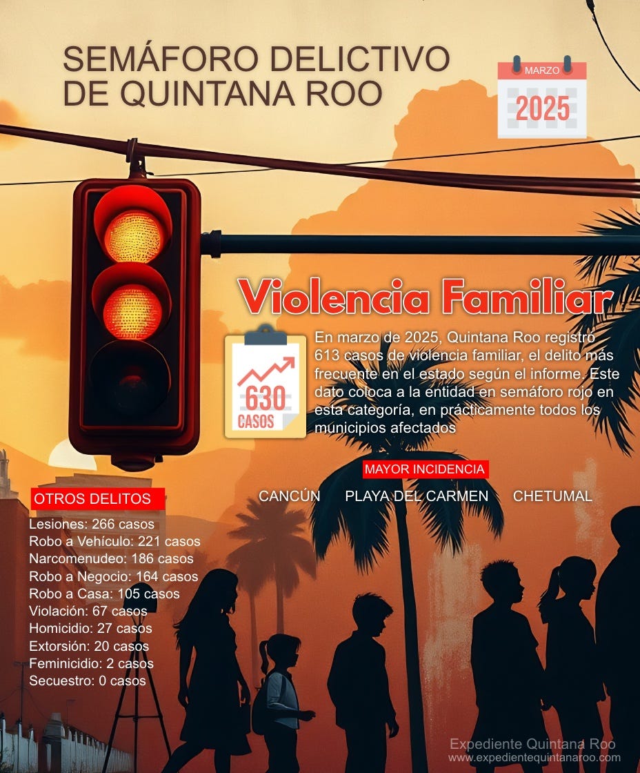 En marzo de 2025, Quintana Roo registró 613 casos de violencia familiar, el delito más frecuente en el estado según el informe.