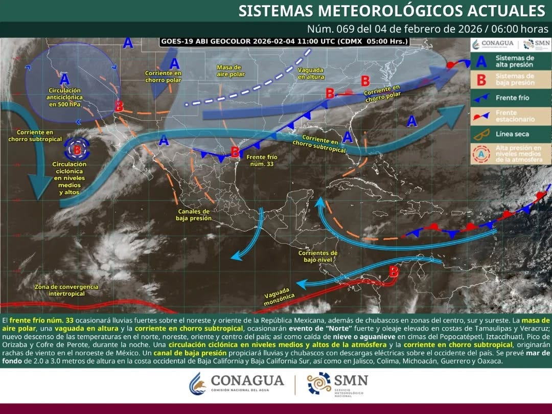 El Frente Frío Número 33 ya recorre el noreste y oriente del país, trayendo el grueso de su acción a Yucatán y Quintana Roo más hacia el jueves y viernes, cuando sí podríamos ver un reforzamiento del norte, más nublados y alguna lluvia dispersa. Por ahora, disfrutemos este día fresco-mañanero y cálido-día que es típico de un “norte” moderado en febrero.