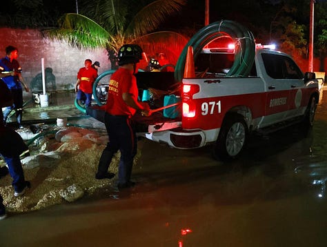 Cancún.- La Presidenta Municipal, Ana Paty Peralta, junto con el secretario general del Ayuntamiento, Pablo Gutiérrez, acudieron a la colonia Donceles 28 para supervisar los trabajos de reparación de una de las tuberías del cárcamo, el cual es fundamental para el desalojo del agua pluvial en la zona.