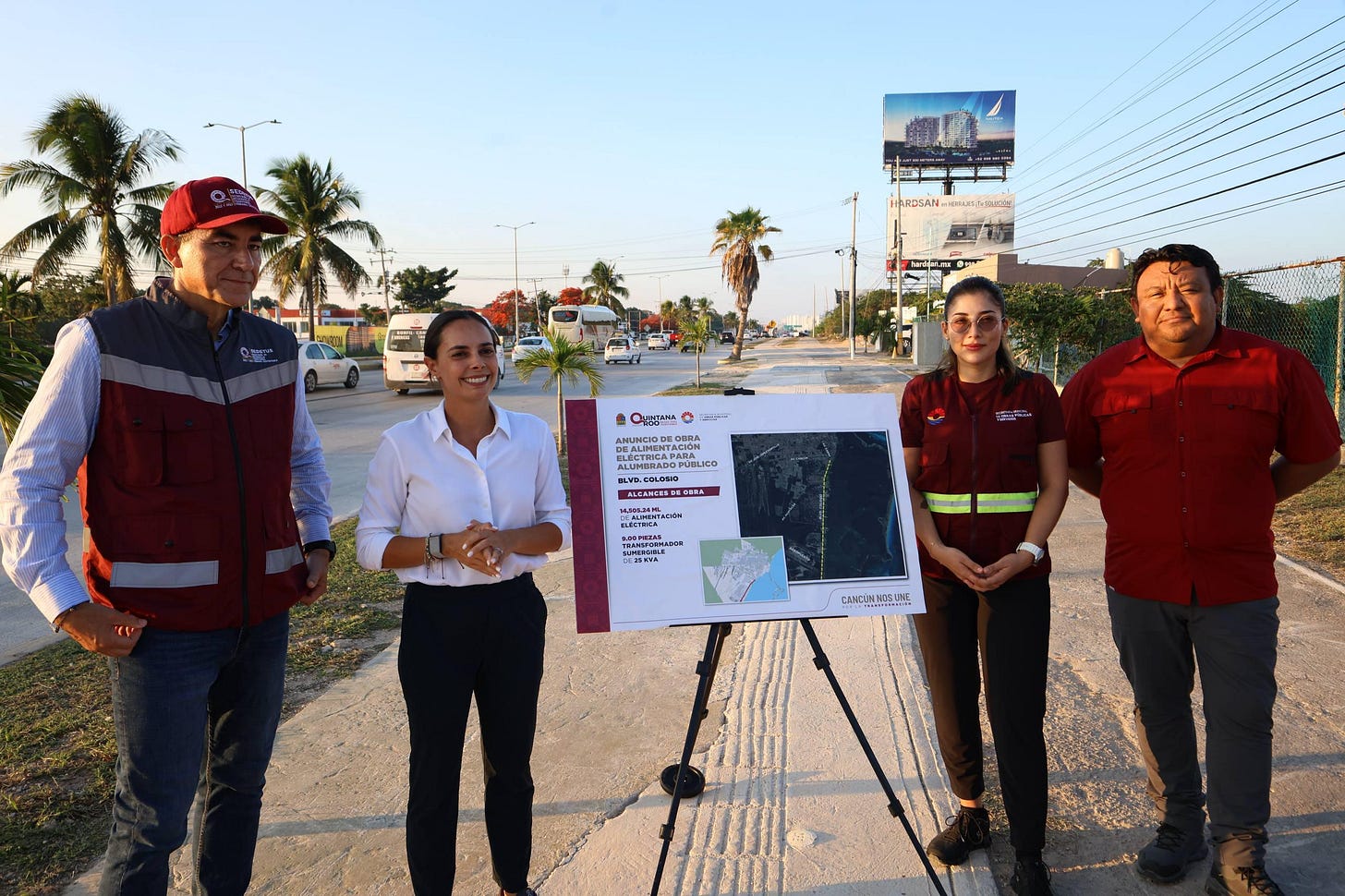 Cancún.- La Presidenta Municipal, Ana Paty Peralta, anunció el inicio de la obra de alimentación eléctrica para el alumbrado público en el Boulevard Luis Donaldo Colosio, un proyecto que contempla 14 mil 505.24 metros lineales de alimentación eléctrica y la instalación de 9 transformadores sumergibles de 25 KVA, como una acción estratégica que forma parte del proyecto integral de modernización de esta vialidad, una de las más importantes de Cancún.