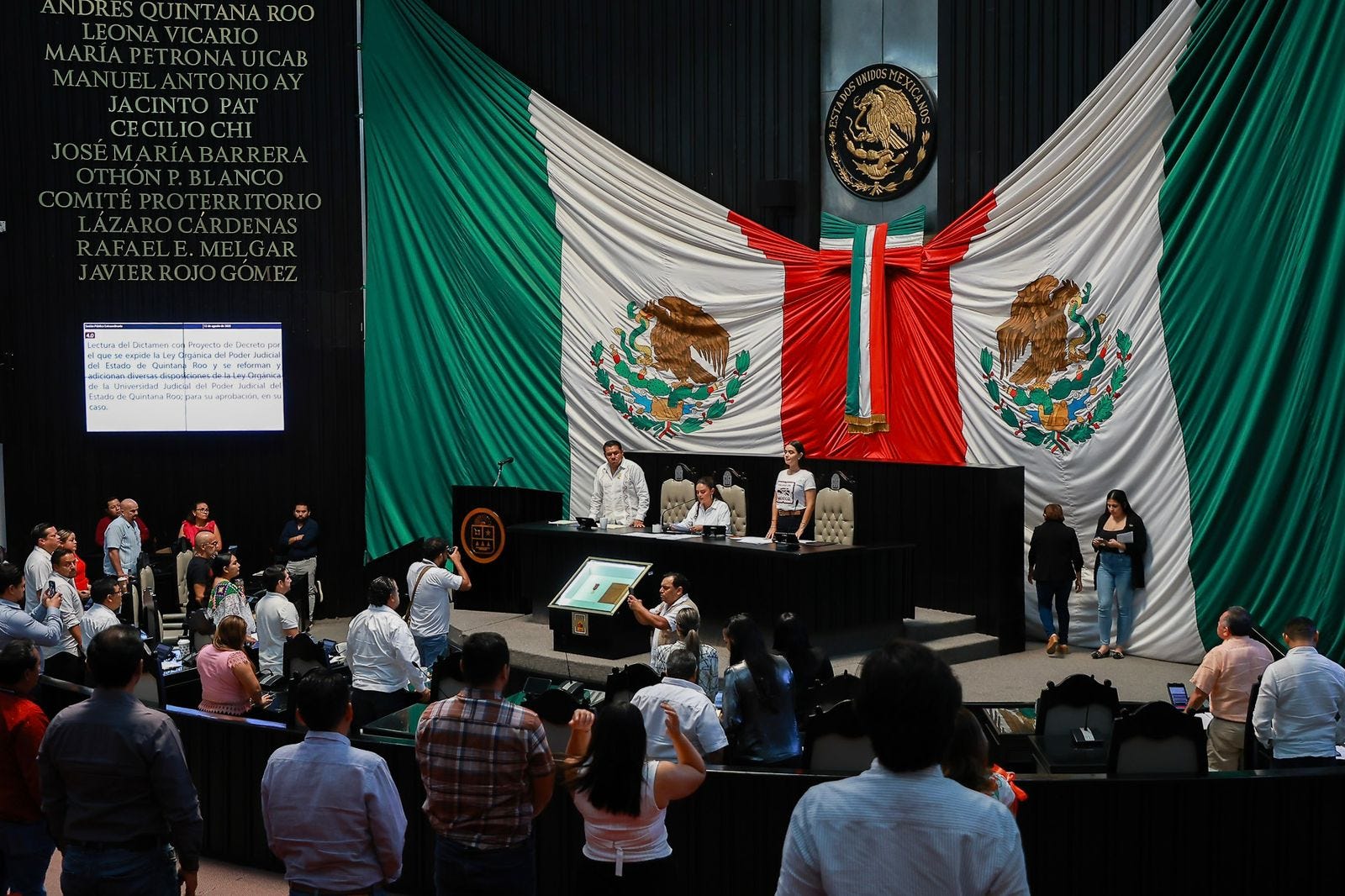 Chetumal.- La Legislatura de la Justicia Social aprobó la nueva Ley Orgánica del Poder Judicial del Estado, como parte del proceso de armonización de la reforma para el nuevo Poder Judicial que entrará en funciones el próximo 1 de septiembre del presente año, fecha en la que además rendirán protesta las personas juzgadoras electas a través de un proceso democrático histórico.