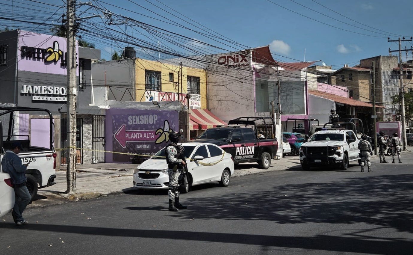 El primer establecimiento intervenido fue el local James Bong, ubicado en la avenida Cobá, a pocos metros de su cruce con la avenida Kabah, en la Supermanzana 31. La diligencia, que comenzó alrededor del mediodía, generó gran movilización: seis patrullas de la Guardia Nacional abanderaron el tráfico, cerrando temporalmente uno de los carriles de la avenida durante aproximadamente dos horas.