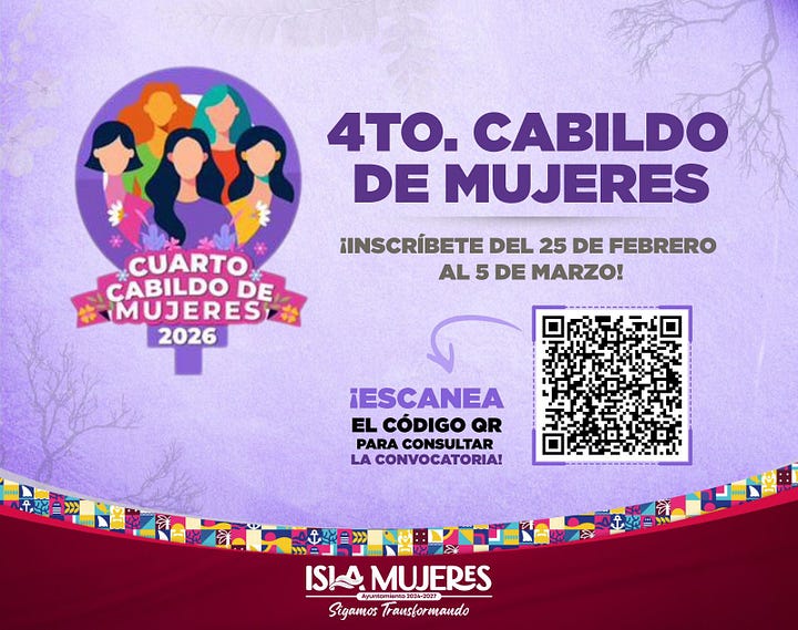 Isla Mujeres.- Con el objetivo de fomentar el diálogo, impulsar el liderazgo femenino y consolidar un Gobierno cercano, incluyente y con perspectiva de género, la Presidenta Municipal, Atenea Gómez Ricalde, invita a las isleñas a participar en la Cuarta Edición del Cabildo de Mujeres 2026, un espacio creado para fortalecer la participación ciudadana y política de las mujeres en la vida pública del municipio.
