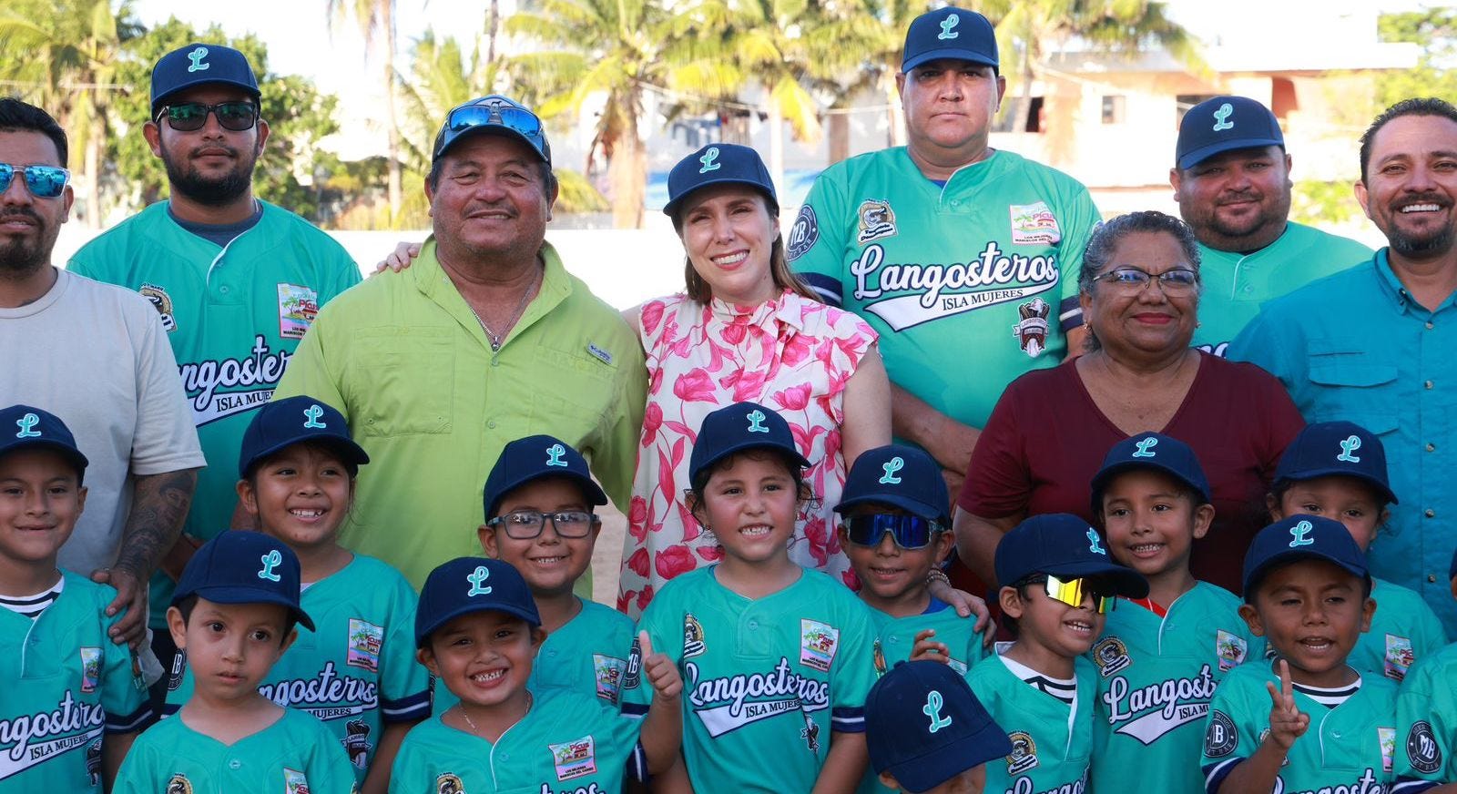 Isla Mujeres.- La Presidenta Municipal, Atenea Gómez Ricalde, refrendó su compromiso con la niñez isleña, al entregar nuevos uniformes completos a las niñas y niños del equipo Langosteros de Isla Mujeres, quienes participan en la Liga Vinicio Castillo.