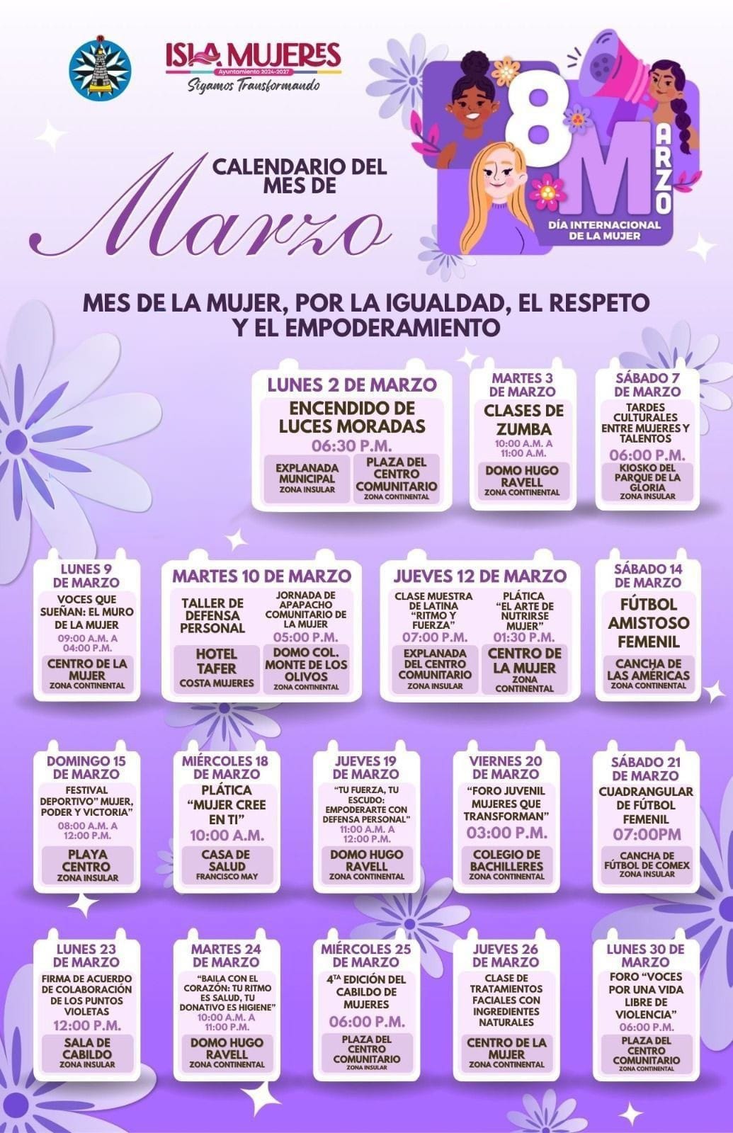 La agenda arranca este lunes 2 de marzo con el Encendido de Luces, a las 18:00 horas, en la Explanada Municipal de la Isla y en la Plaza del Centro Comunitario de la Zona Continental. Las actividades concluirán el 30 de marzo con el foro “Por una vida libre de violencia”, a las 18:00 horas, en la Plaza del Centro Comunitario, en Zona Continental.
