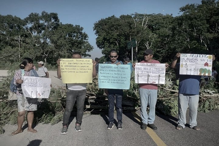 Chetumal.— Habitantes de 14 comunidades, incluidas Tres Garantías, Tomás Garrido Canabal, San José de la Montaña, Caobas y Dos Aguadas, bloquearon la carretera Nicolás Bravo-Escárcega en el entronque del Kilómetro 77 el 5 de septiembre de 2025, debido al incumplimiento de la Comisión Federal de Electricidad (CFE) en mejorar el suministro eléctrico.