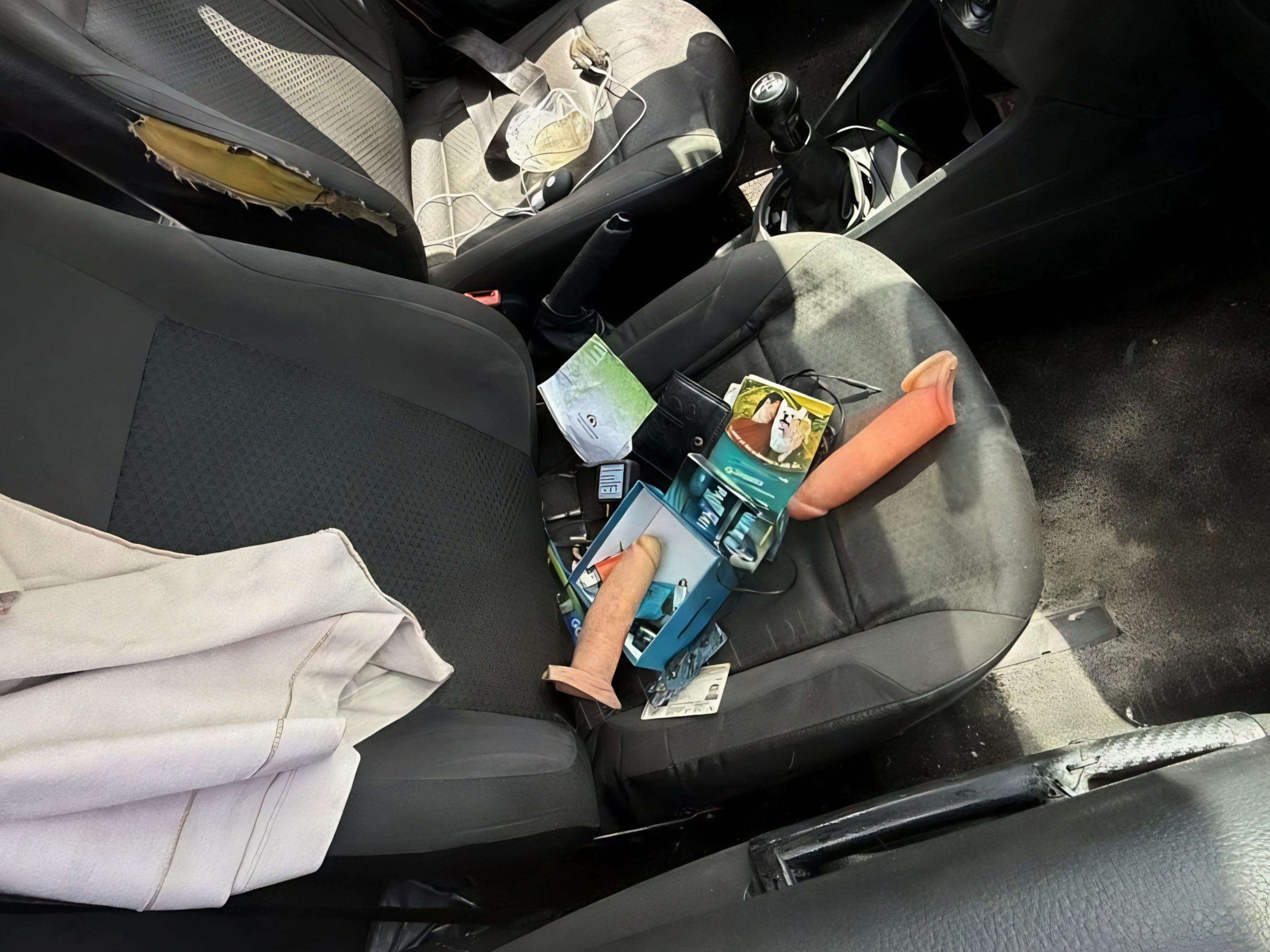 Las fotos no mienten: asientos desgarrados, un revoltijo de lubricantes, “juguetitos” que harían sonrojar a un vibrador profesional, y hasta un consolador tamaño extra que parecía saludar a los transeúntes.