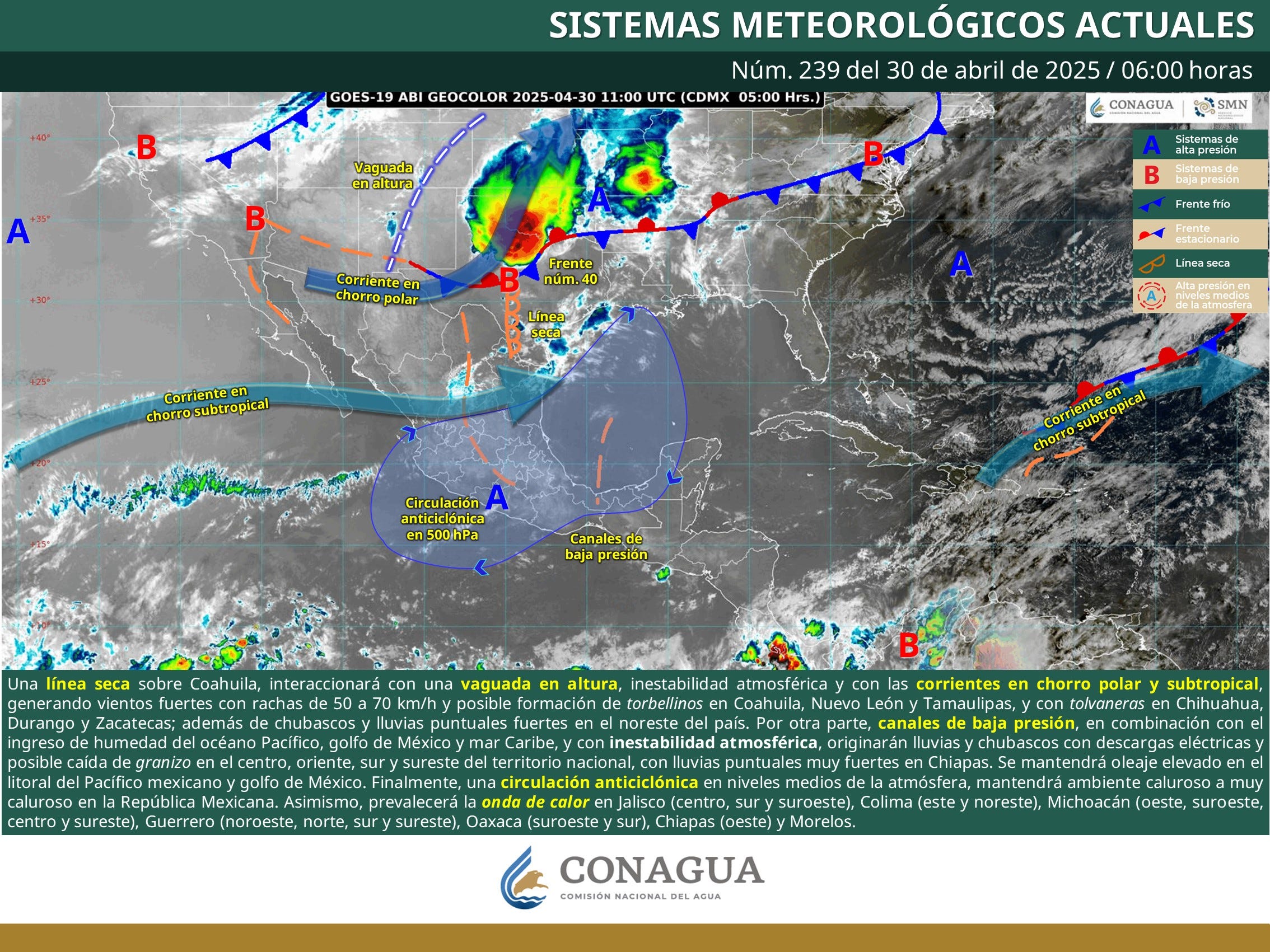 José María Morelos: Cielo despejado a parcialmente nublado, baja probabilidad de lluvias. Viento 20-30 km/h con rachas. Temp. máx.: 35-37°C, mín.: 22-24°C. Sensación térmica: 40°C. Presión: 1015 hPa.