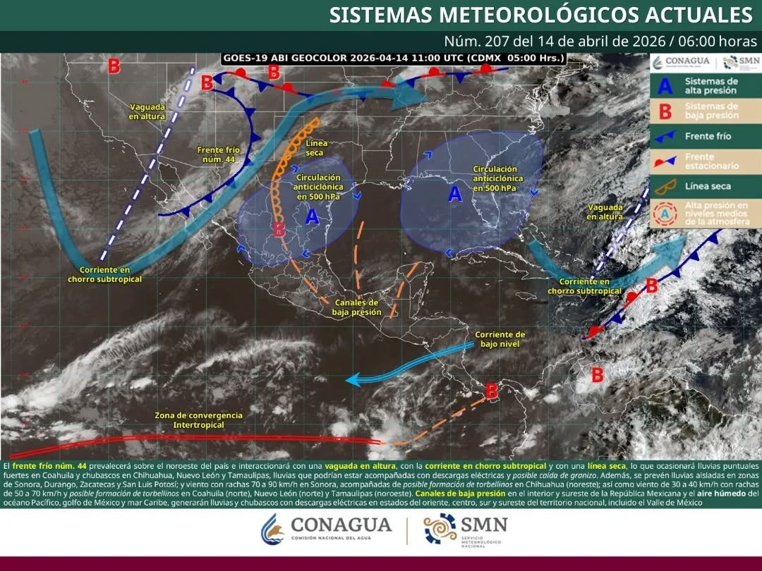 Cozumel: Cielo medio nublado, sin lluvias importantes. Temperaturas más frescas: máxima 27-29°C, mínima 23-25°C, sensación 32°C. Vientos este 18-36 km/h con rachas de 40 km/h. Mareas con periodos más prolongados.