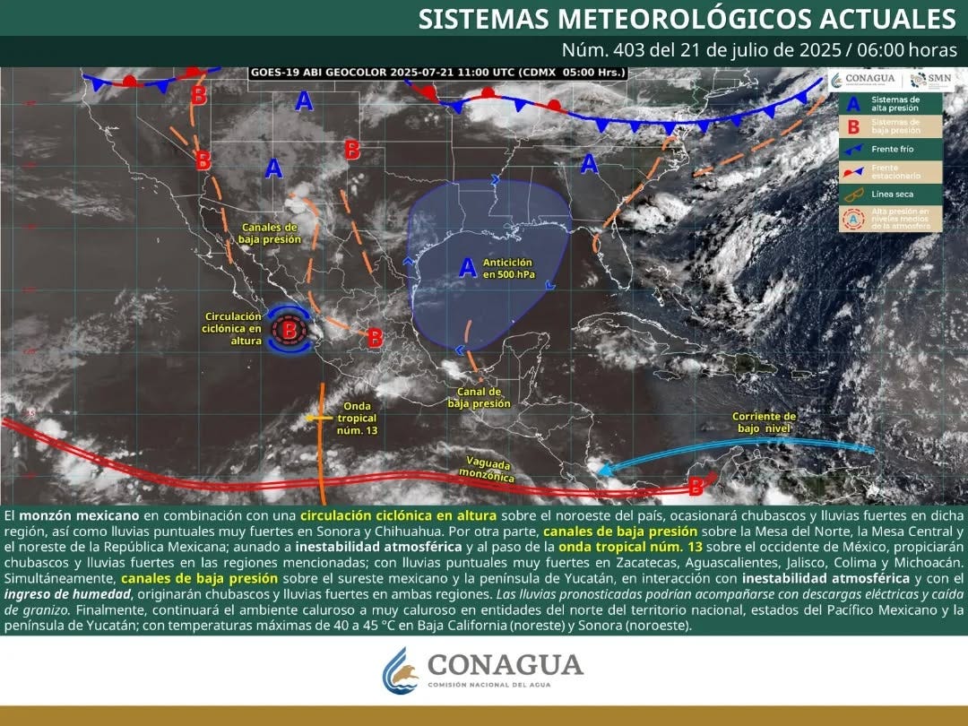 La jornada iniciará con cielos mayormente despejados, pero la nubosidad irá en aumento a lo largo del día. Las temperaturas máximas rondarán entre los 31 y 39 °C, con sensaciones térmicas que podrían superar los 42 °C debido a la humedad del 60-70%. Las lluvias, con acumulados de 5 a 25 mm, se presentarán principalmente en la tarde y noche, acompañadas de descargas eléctricas, lo que requiere precaución en actividades al aire libre.
