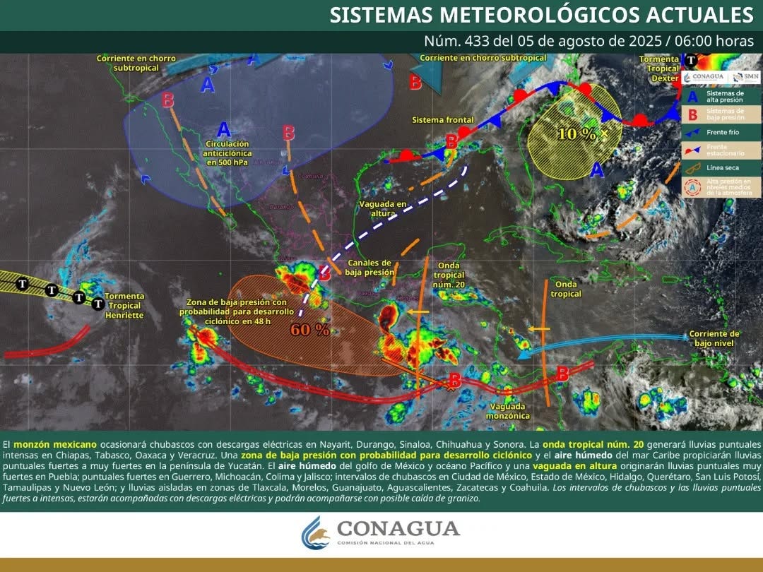 La onda tropical número 20, combinada con la humedad del Caribe, mantendrá cielos parcialmente nublados en la mañana, con un aumento significativo de nubes hacia la tarde. Se esperan intervalos de chubascos y lluvias puntuales fuertes, acompañadas de actividad eléctrica, especialmente en el interior y sur del estado. Las temperaturas serán muy calurosas, con máximas de hasta 38 °C y sensaciones térmicas que podrían alcanzar los 41 °C. Los vientos del este y sureste, con rachas de hasta 50 km/h en zonas costeras, agitarán el oleaje, que oscilará entre 3 y 5 pies en el canal de Yucatán.