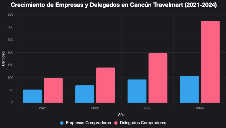 Desde su creación en 1989, tras el impacto de un huracán, el Cancún Travelmart ha evolucionado significativamente. En 2021, contó con 53 empresas compradoras y 99 delegados, creciendo en 2022 un 33% en empresas y 41% en delegados. Para 2023, el evento registró un aumento adicional del 33% en empresas y 41.3% en delegados, alcanzando en 2024 un récord de 107 empresas proveedoras y 325 delegados. Este crecimiento del 101% en proveedores desde 2021 subraya la relevancia del evento y la confianza en el destino.