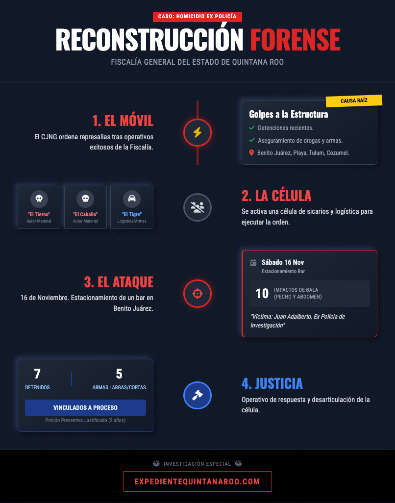 «De conformidad con las indagatorias, se pudo establecer que los detenidos privaron de la vida al policía de investigación derivado de las recientes detenciones de integrantes de este grupo criminal, así como del aseguramiento de vehículos, drogas, armas de fuego y cateos realizadas en bodegas que utilizaban para la comisión de sus delitos, principalmente en los municipios de Benito Juárez, Playa del Carmen, Tulum y Cozumel.»