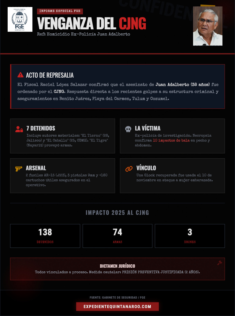 Cancún.— El fiscal general de Quintana Roo, Raciel López Salazar, reveló esta mañana que el homicidio del ex policía de investigación Juan Adalberto, de 38 años, perpetrado el 16 de noviembre en el estacionamiento de un bar de Benito Juárez, fue un acto de venganza ordenado por el Cártel Jalisco Nueva Generación (CJNG) por los recientes golpes a su estructura criminal en el estado.