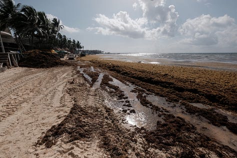 Contingencia de sargazo en las playas de Playa del Carmen, de Playa Fundadores a El Recodo. Las barreras de contención no están dando los resultados esperados, el sargazo llega en grandes cantidades a la playa. Pocos trabajadores de limpieza de playas en el lugar, tractores con góndolas transportan el sargazo. No se observaron turistas en las playas. Imágenes captadas la mañana de este miércoles.