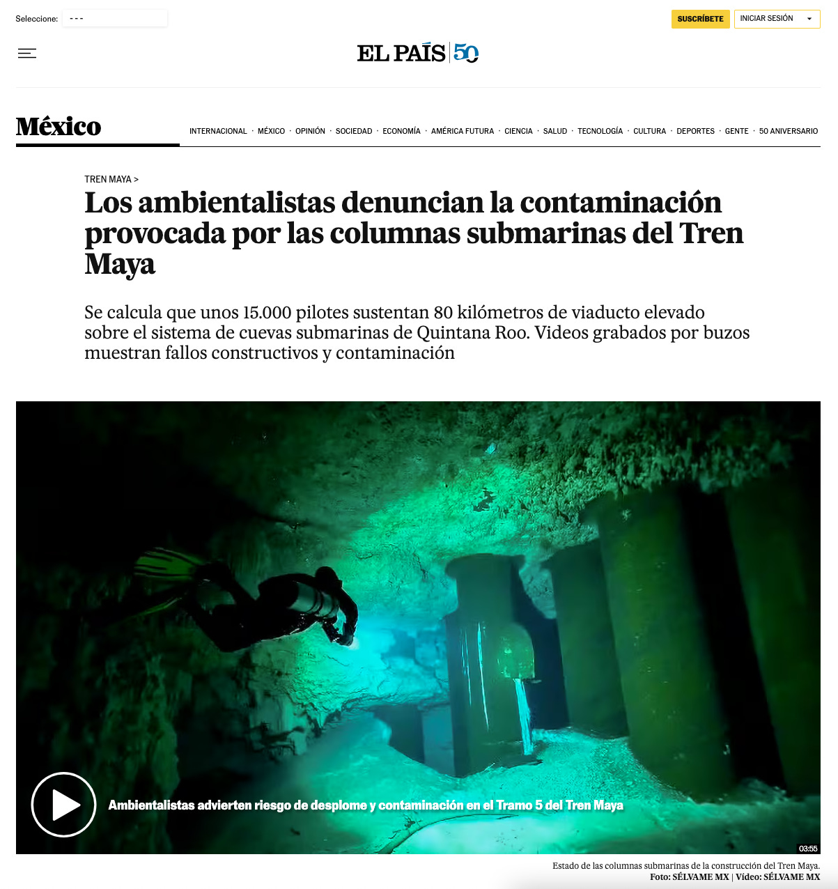 Esta publicación refuerza las alertas de colectivos ambientalistas y pone de relieve, desde uno de los medios más influyentes del mundo hispano, los impactos persistentes del Tren Maya en uno de los sistemas de cuevas sumergidas más importantes del planeta.