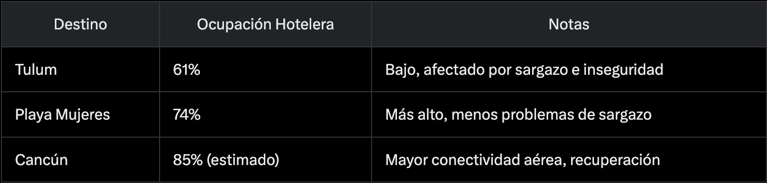 Playa Mujeres en la zona continental de Isla Mujeres, demuestra que el éxito es posible. Con una ocupación del 74% en junio de 2025, según reportes de la Asociación de Hoteles de Cancún, Puerto Morelos e Isla Mujeres, este destino de lujo se beneficia de una gestión más responsable, menor impacto del sargazo y una percepción de seguridad que Tulum ha perdido. Mientras Playa Mujeres atrae a viajeros con poder adquisitivo, Tulum se desangra en una guerra de tarifas que, como advirtió recientemente en rueda de prensa, Samantha Frachey López-Lira del Grupo Turístico Lomas, “amenaza con destruir la exclusividad del Caribe mexicano”. Cancún, con tarifas hoteleras de 700 a 2,000 dólares por noche (13,400 a 38,300 pesos), sigue siendo un referente de lujo, pero Tulum, bajo el yugo de Castañón, se desliza hacia la mediocridad.