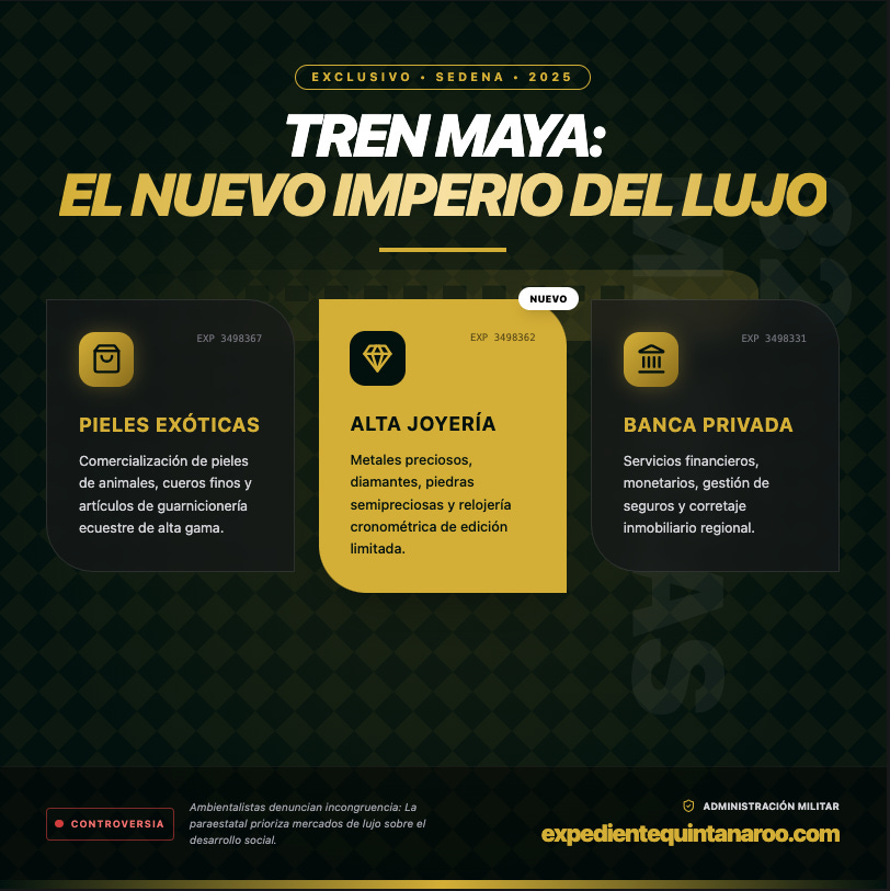 Cancún.— La empresa paraestatal Tren Maya, administrada por la Secretaría de la Defensa Nacional (Sedena), ha iniciado formalmente el proceso para diversificar sus operaciones comerciales más allá del transporte ferroviario. A través de una serie de solicitudes ante el Instituto Mexicano de la Propiedad Industrial (IMPI), la entidad busca obtener el registro de marca para comercializar pieles de animales, artículos de joyería fina y ofrecer servicios bancarios, un giro de negocio que ha comenzado a generar controversia.