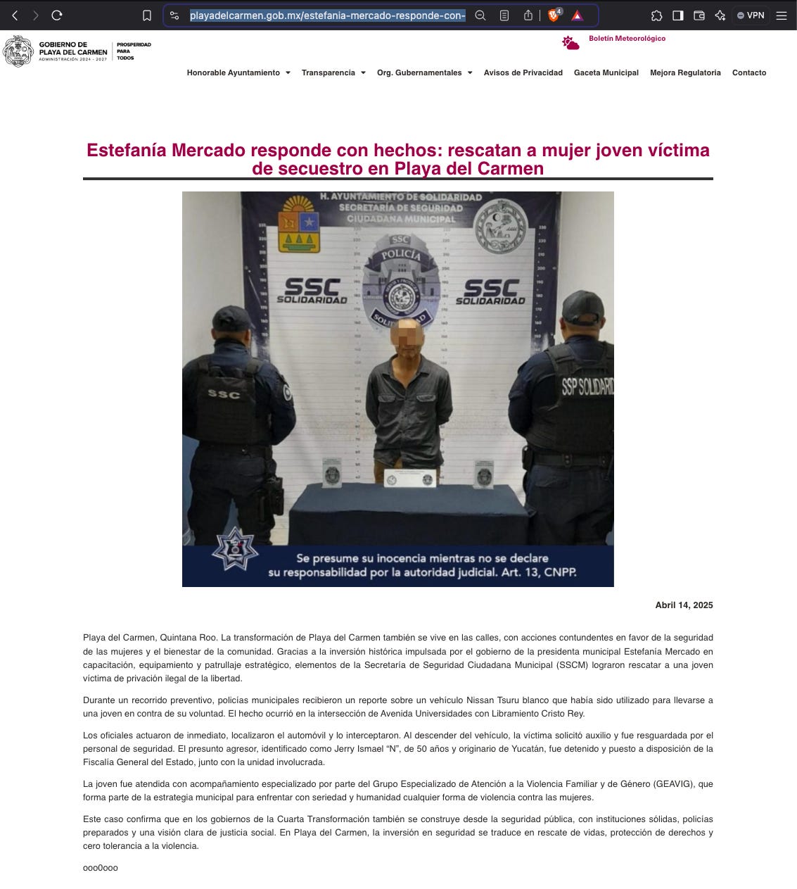 Playa del Carmen.- Un boletín oficial emitido y distribuido por la Dirección de Comunicación Social del Ayuntamiento de Playa del Carmen utiliza un caso sensible —el rescate de una joven víctima de secuestro— para promover la figura de la presidenta municipal, Estefanía Mercado. El comunicado, titulado “Estefanía Mercado responde con hechos: rescatan a mujer joven víctima de secuestro en Playa del Carmen”, pone el nombre de la presidenta como eje central, atribuyéndole directamente el éxito de un operativo llevado a cabo por la Secretaría de Seguridad Ciudadana Municipal (SSCM).