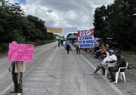 En el tramo carretero de Costa Maya, los manifestantes –muchos de ellos ejidatarios y pequeños ganaderos– colocaron mantas con consignas como “Sin agua justa, sin seguridad y sin ley justa México se detiene” y advirtieron que, si la ley se publica en el Diario Oficial de la Federación sin modificaciones, pasarán de la protesta informativa a bloqueos totales.