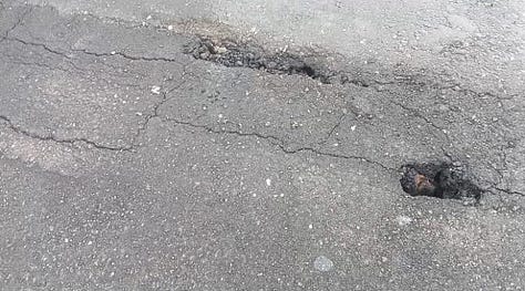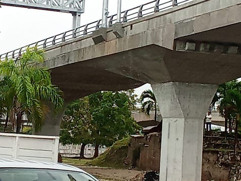 Áreas con concreto agrietado y desprendimientos en bordes, así como posibles signos de mal compactado o asentamientos en el distribuidor vial y en partes del puente elevado.