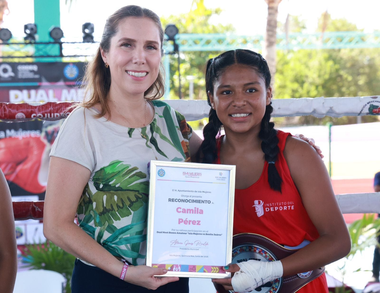 Isla Mujeres.- Con el firme compromiso de seguir impulsando el deporte como una herramienta de transformación social y desarrollo integral para las y los jóvenes, el Gobierno de Isla Mujeres, que encabeza la Presidenta Municipal Atenea Gómez Ricalde, celebró con gran éxito el primer Dual Meet de Box Amateur en el Domo Bicentenario.