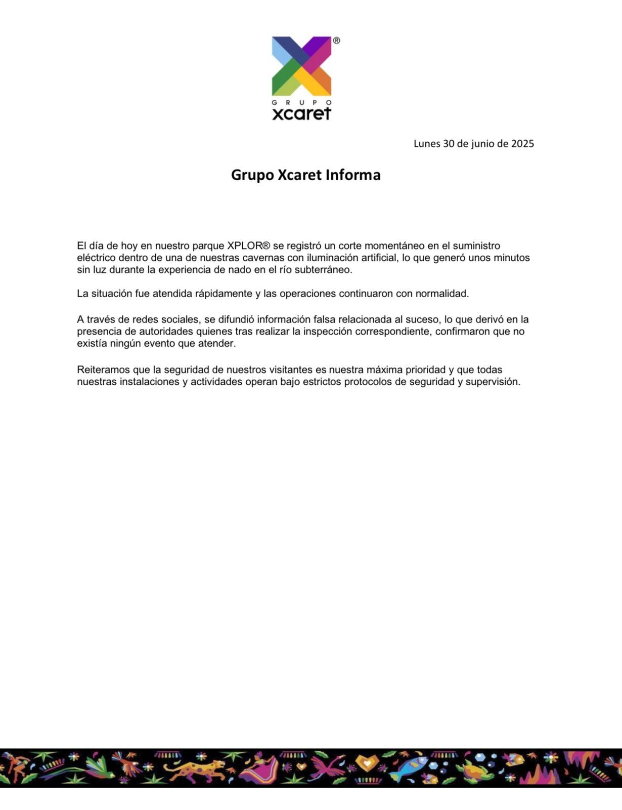 Grupo Xcaret emitió un comunicado aclarando los hechos, enfatizando que no ocurrió ningún percance significativo y que el personal actuó de inmediato para restablecer la normalidad. Las autoridades locales, alertadas por los rumores, inspeccionaron las instalaciones y confirmaron que no había motivos para intervenir. La empresa subrayó su compromiso con la seguridad, destacando que Xplor opera bajo estrictos protocolos para garantizar la protección de sus visitantes.