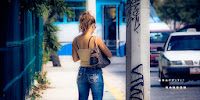 mujer camina por una acera mientras trabajadores la ven pasar, en el centro de