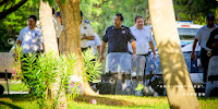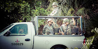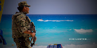 Dos efectivos de la Armada de México intercambian saludos con un turista durante un recorrido de vigilancia en las playas de Isla Mujeres; las costas de Quintana Roo están resguardadas por miembros del Ejército Mexicano, quienes realizan también acciones de combate al narcotráfico y otros delitos.