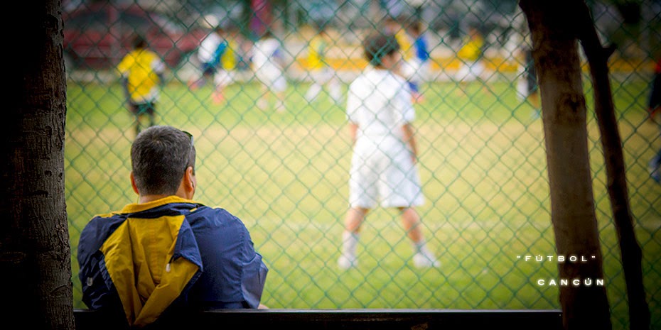 Un padre de familia ve desde la grada el entrenamiento del fútbol infantil, en el complejo deportivo Kuchil-Baxal, en Cancún, a donde asisten cientos de niños y niñas a practicar este y otros deportes.