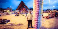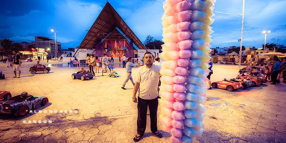 Un hombre está vendiendo algodones de azúcar en el Parque Las Palapas, de Cancún; algunas tradiciones se mantienen, y pese a que este polo turístico apenas tiene 43 años de edad (2013), hay algunas costumbres que se van arraigando como propias, resultado del crisol multicultural que prevalece aquí.