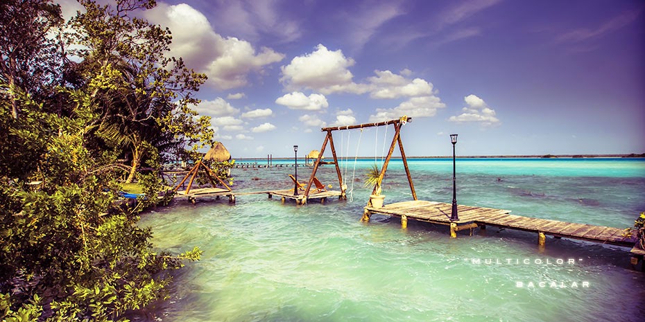 Columpios y otros accesorios de recreación están en la orilla de la "Laguna de los Siete Colores", en Bacalar; es uno de los atractivos del sur de Quintana Roo, conocido por sus múltiples colores, este manto de agua es también un lugar para la práctica de deportes y otras actividades acuáticas, además cuenta con hoteles y restaurantes.
