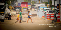 Una pareja camina sobre la avenida Tulum, en Cancún, atrás de ellos la maquinaria que realiza los trabajos de remodelación del centro de la ciudad, que contará con espacios más amplios y remodelados para el tráfico vehicular, los peatones y la flora.