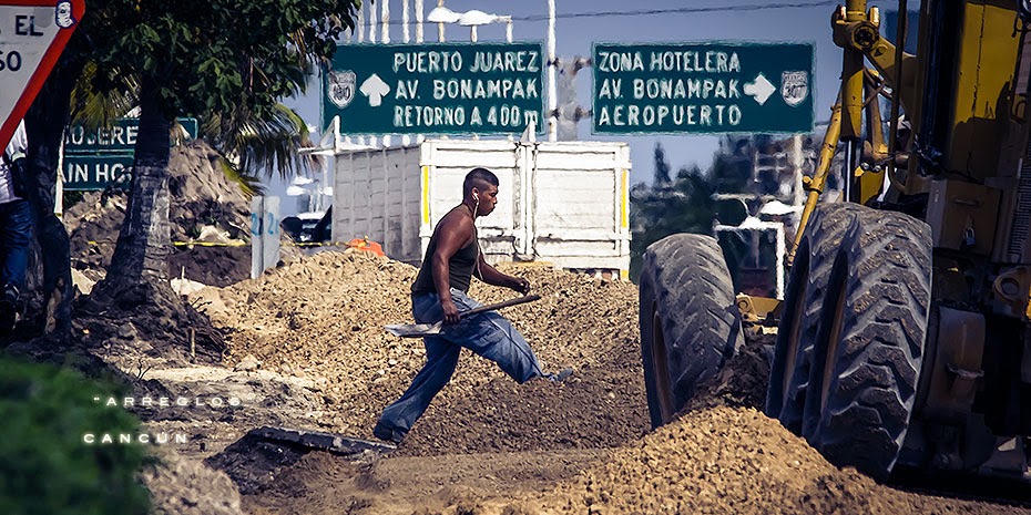 Un hombre está trabajando con una pala mientras escucha algo en su móvil, en una de las obras de repavimentación y ampliación de la avenida José López Portillo, en Cancún; estos arreglos que se llevan a cabo en esta importante vía están causando estragos al tráfico vehicular y al comercio establecido en esta rúa, sin embargo, los resultados serán de beneficio, así que habrá que tener paciencia.