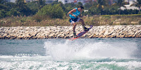 Un deportista carga una tabla de surf motorizada durante un campeonato internacional con sede en Cancún, éste deporte surgió hace apenas dos años y las playas del Caribe Mexicano ya se convirtieron en uno de los lugares más importantes en el Mundo para la práctica de esta disciplina.