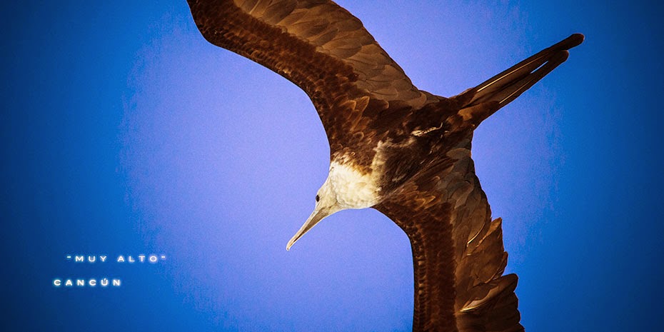Una Fragata vuela sobre las playas de Cancún, estas aves son –junto con los pelícanos y las gaviotas-, la especie alada más común en este polo turístico, sólo que a diferencia de los segundos, este emplumado vuela mucho más alto y no es fácil verlo con tanto detalle, como en esta foto.