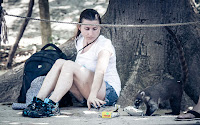 Una turista se toma un minuto antes de continuar sus actividades en un parque de la Riviera Maya, los millones de vacacionistas que llegan cada a año a las paradisiacas playas del norte de Quintana Roo procedentes de todo el Mundo, tienen una agenda llena de acción que les hacen aún más divertidos sus días de asueto.