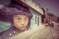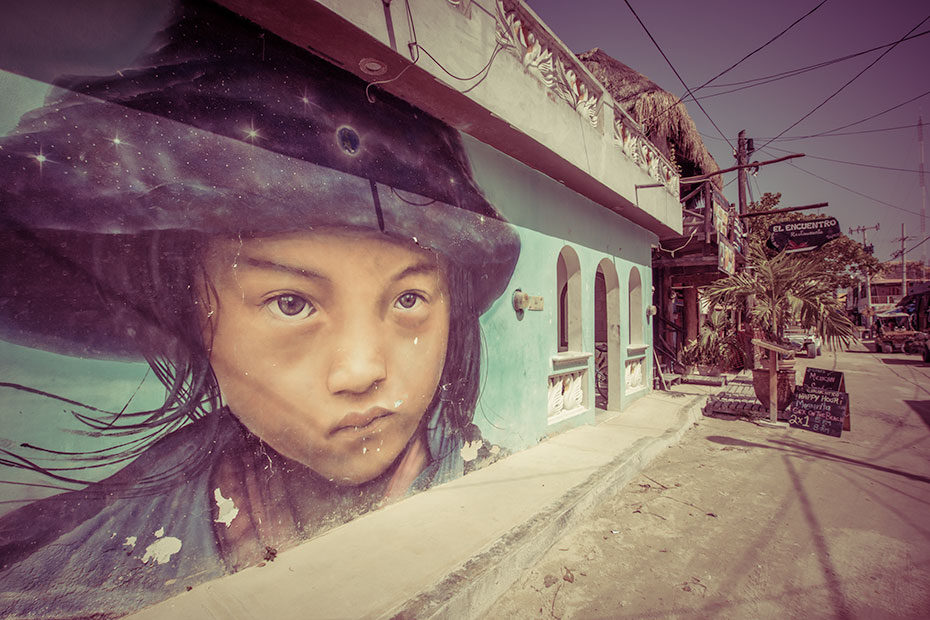 Un mural con la imagen de una niña adorna la barda de una casa en una calle de la Isla Holbox, lugar al que arriban cada año miles de turistas atraídos por la naturaleza de la ínsula.