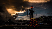Un vendedor de esquites con un enorme sombrero revolucionario destaca en el parque de las Palapas durante las festividades patrias.