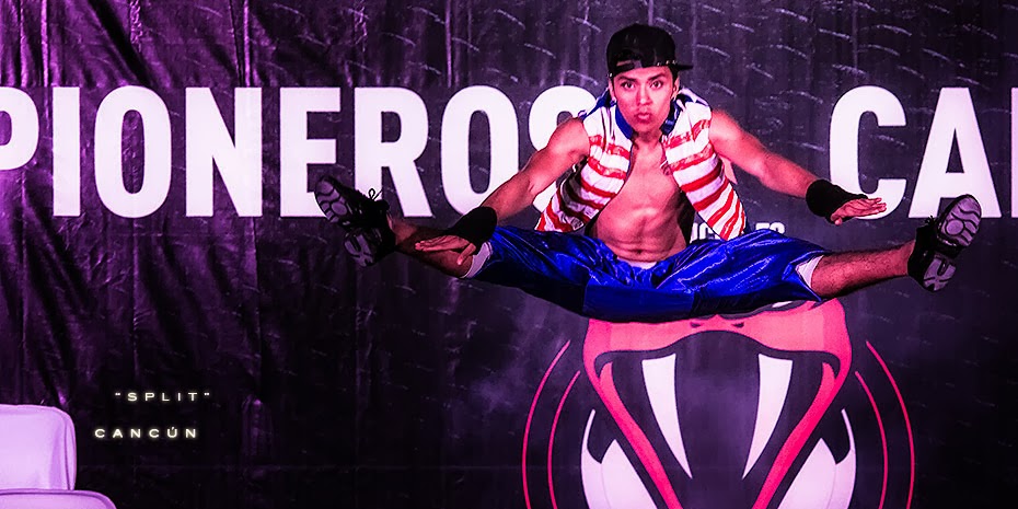 Un bailarín está suspendido en el aire mientras hace un “Split”, durante la presentación del nuevo uniforme del equipo “Pioneros de Cancún” del fútbol de la Segunda División.