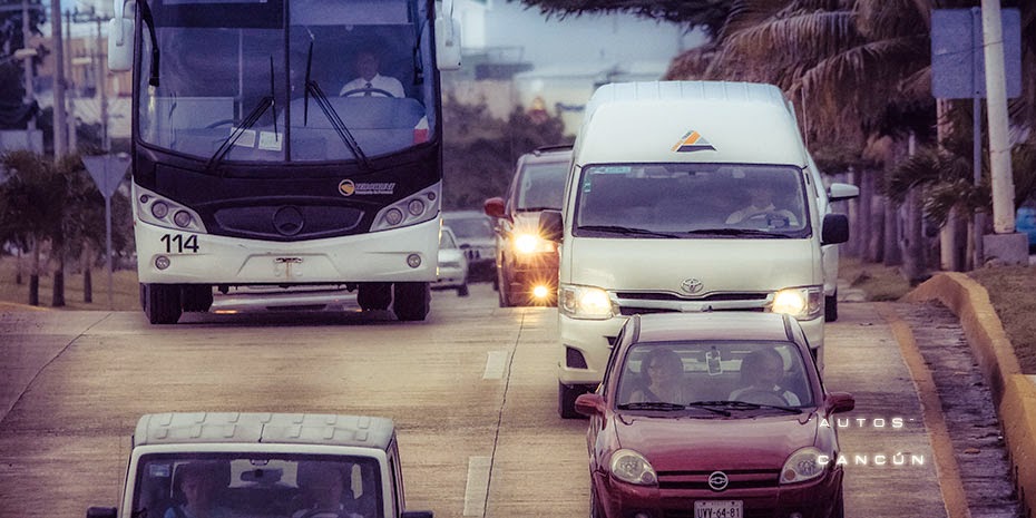 Un autobús de pasajeros emerge del paso a desnivel de la avenida Luis Donaldo Colosio llegando a Cancún al caer la noche, al fondo las luces de la ciudad dan la bienvenida a miles de locales y foráneos que circulan por este polo turístico.