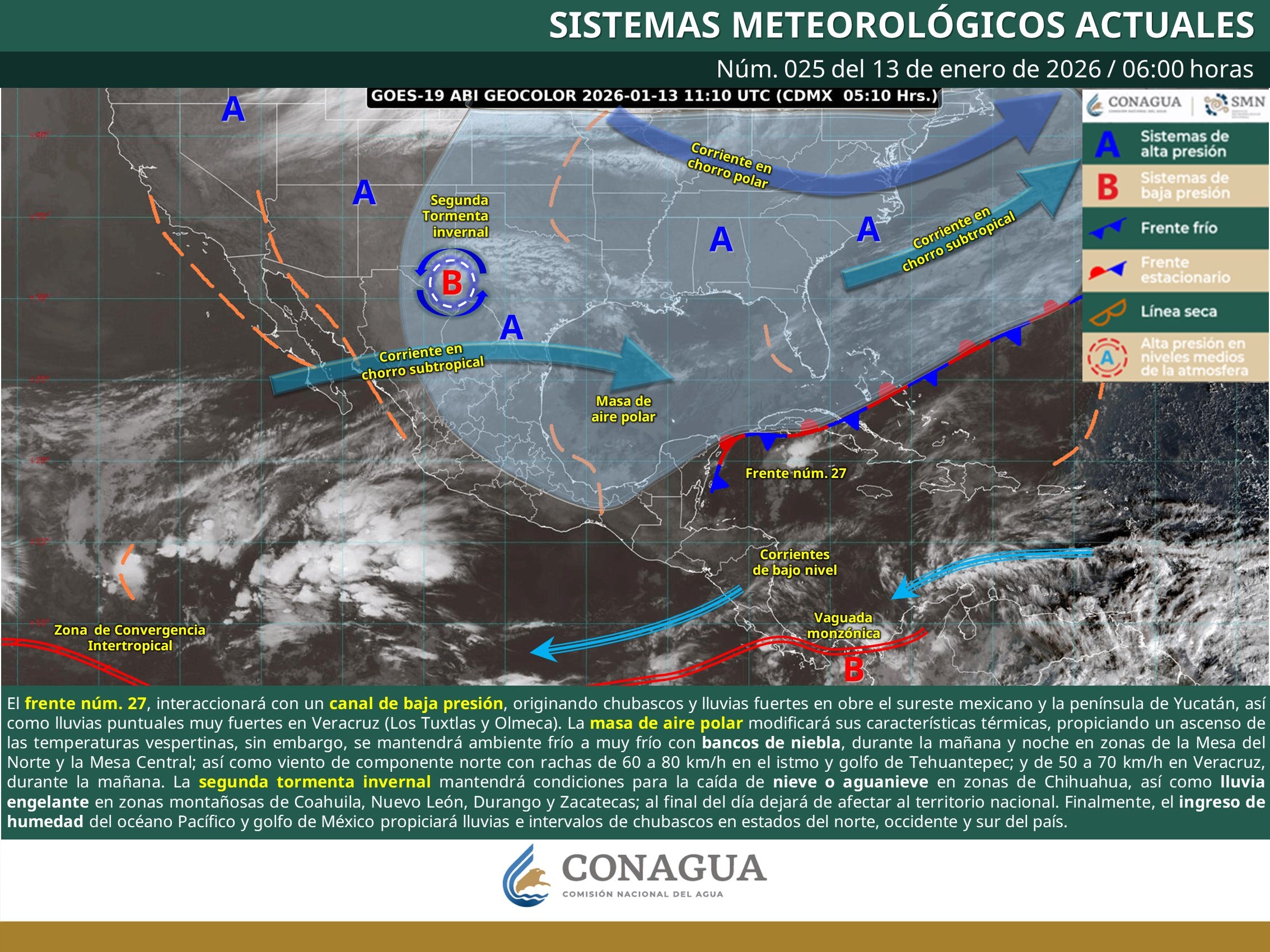 Chetumal.- ¡Buenos días, quintanarroenses! Aquí les traigo el reporte completo para este martes 13 de enero de 2026, directo desde la trinchera meteorológica. El frente frío número 27 ya se instaló como estacionario sobre la Península de Yucatán, y la masa de aire polar que lo acompaña sigue inyectando humedad del Mar Caribe. Resultado: cielo mayormente nublado, lluvias que van de aisladas a puntuales fuertes (25-50 mm en varios puntos), viento del noreste con rachas que molestan en la costa y ese ambiente templado-caluroso de día, pero fresco al amanecer, sobre todo en el interior rural.