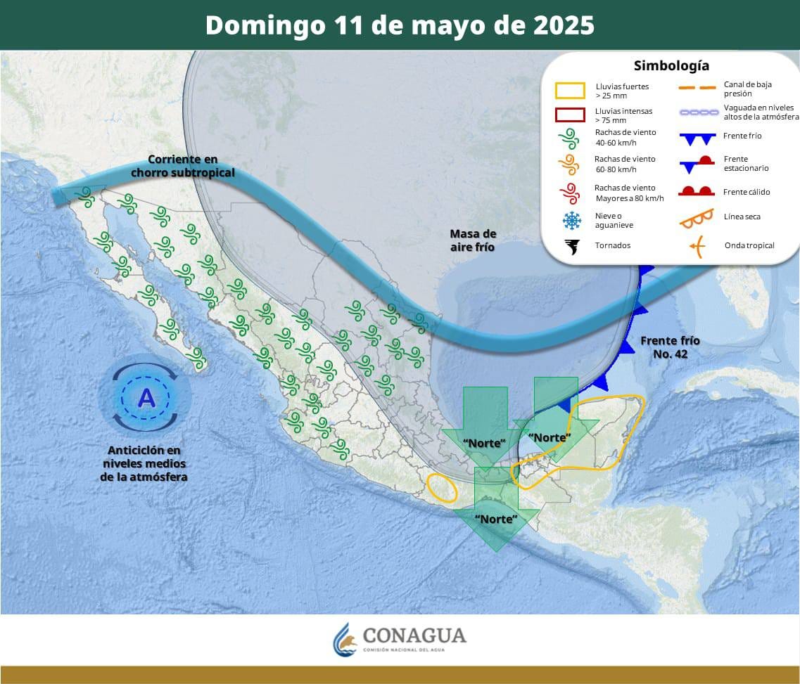 Chetumal.- A partir de la tarde del sábado 10 de mayo, Quintana Roo se prepara para enfrentar los embates del Frente Frío número 42, acompañado de una vaguada prefrontal que promete sacudir la Península de Yucatán durante el fin de semana. Según el Servicio Meteorológico Nacional (SMN) y la Coordinación Estatal de Protección Civil, este fenómeno desatará lluvias torrenciales, vientos fuertes y oleaje elevado, generando riesgos significativos en la región.
