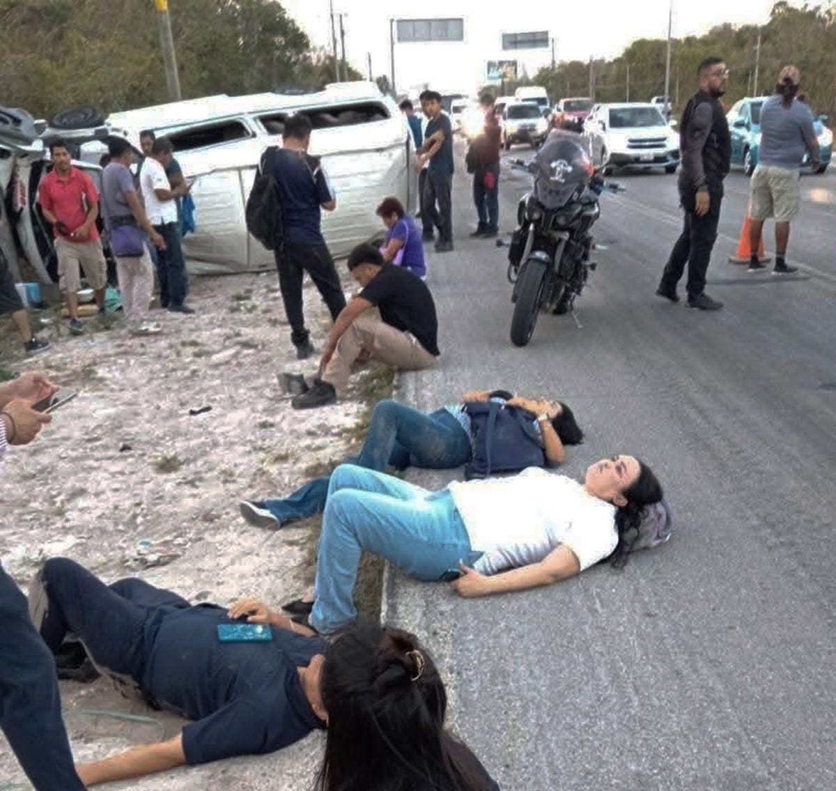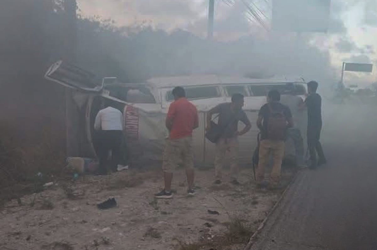 Puerto Morelos.— Esta tarde se reportó un aparatoso accidente de tránsito en la carretera federal 307, en el tramo Cancún-Puerto Morelos, a la altura del hotel Royalton. Una van de transporte público volcó tras impactarse presuntamente contra otro vehículo, dejando un saldo preliminar de más de siete personas lesionadas.