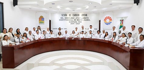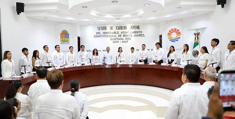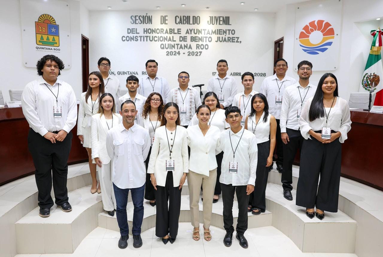 Cancún.- La Presidenta Municipal, Ana Paty Peralta, atestiguó la realización de la Sesión de Cabildo Juvenil 2026, en la que 17 jóvenes cancunenses de entre 18 y 29 años de edad, expusieron sus iniciativas para mejorar y transformar la ciudad en cuatro rubros importantes: empleo, salud, cultura e inclusión.