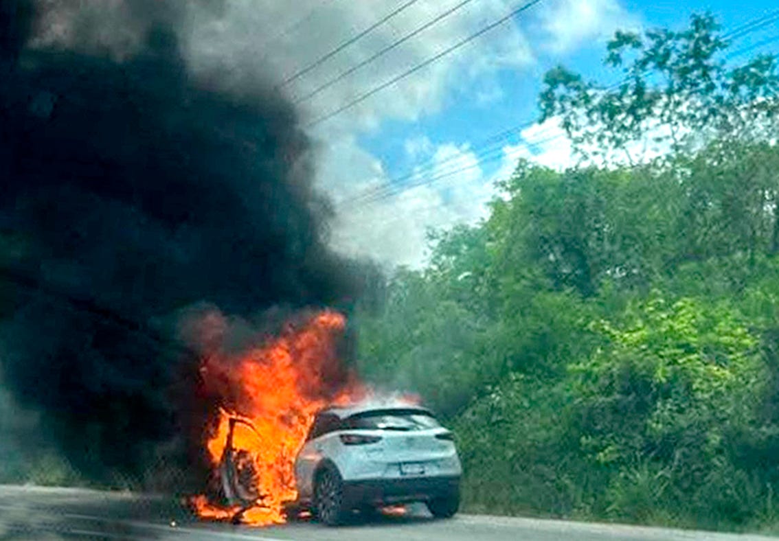 Chetumal.- Un dramático incendio vehicular estremeció la carretera federal 307, en el tramo Chetumal-Bacalar, a escasos 100 metros del icónico Cenote Azul, en Quintana Roo. Según el reporte el fuego, que se desató presuntamente por un corto circuito en el motor, consumió por completo el automóvil, dejando tras de sí una densa columna de humo negro y un espectáculo de llamas que capturaron los transeúntes en imágenes impactantes. Afortunadamente, no se reportaron víctimas, pero el incidente reaviva las alarmas sobre la seguridad en una de las arterias viales más transitadas de la Riviera Maya.