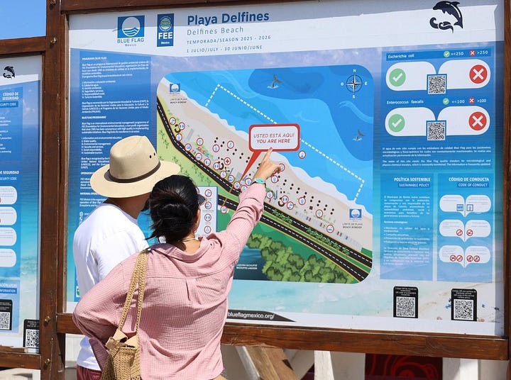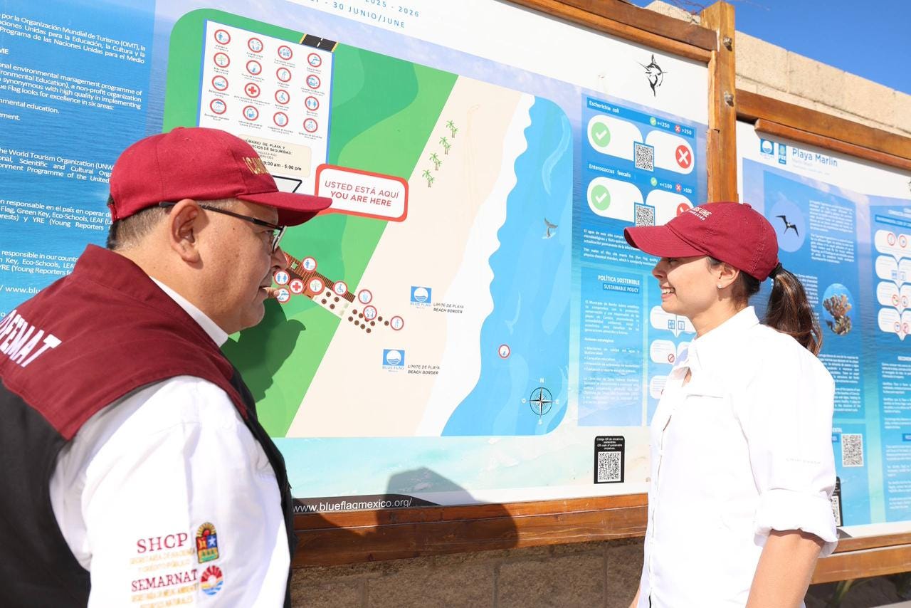 La Alcaldesa informó que el municipio cuenta con siete playas públicas certificadas con el distintivo Blue Flag, reconocimiento internacional que avala su alta calidad, por lo que ofrecen estacionamiento gratuito, accesibilidad universal, baños equipados con regaderas, señaléticas, botes de basura, torre de guardavidas, así como módulos de información por parte del equipo de Zona Federal Marítimo Terrestre (ZOFEMAT) y vigilancia a través de la Policía Turística.