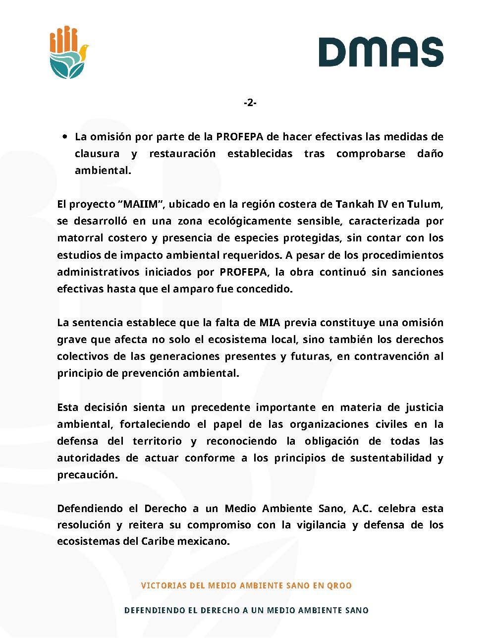 La organización Defendiendo el Derecho a un Medio Ambiente Sano (DMAS) promovió el amparo tras una denuncia vecinal y una inspección de Profepa que confirmó la falta de la MIA, pese a un plazo de 70 días otorgado a los inversionistas para tramitarla. El fallo fortalece el rol de la sociedad civil en la defensa del territorio y expone un patrón de construir sin permisos para luego buscar regularización, práctica que DMAS vincula a otros casos, como el de Adamar en Bahía de Soliman.